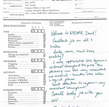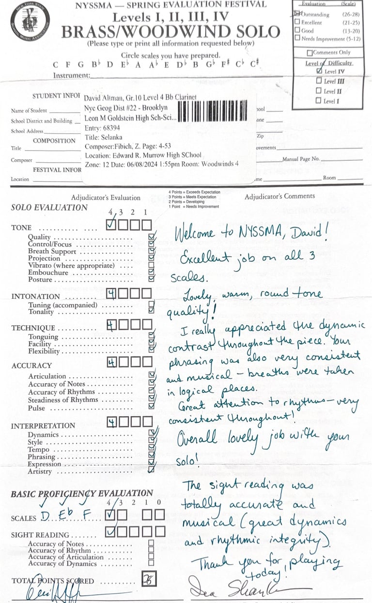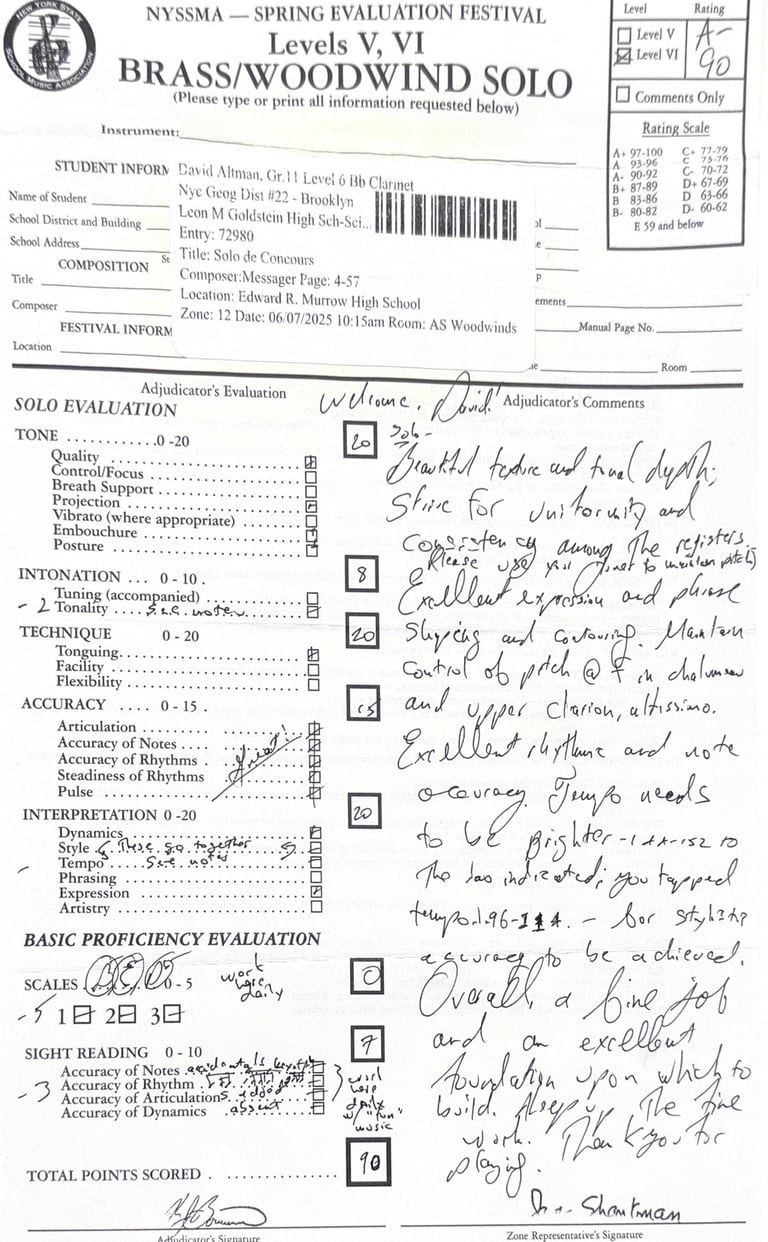Recognized by the New York State School Music Association for advanced musical achievement. Demonstrated excellence in technique, tone, and performance across multiple adjudicated levels.